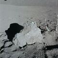 David Scott collecting samples from a boulder down the northeast slope from the rim of St. George