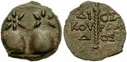 Although the sea made serious inroads upon the territory of Dioscurias, it continued to flourish and became one of the key cities in the realm of Mithridates VI of Pontus in the 2nd century BC and supported his cause until the end. Dioscurias issued bronze coinage around 100 BC featuring the symbols of the Dioskuri and Dionysus.[31] Under the Roman emperor Augustus the city assumed the name of Sebastopolis[32] (Greek: Σεβαστούπολις). But its prosperity was past, and in the 1st century Pliny the Elder described the place as virtually deserted though the town still continued to exist during the times of Arrian in the 130s.[33] The remains of towers and walls of Sebastopolis have been found underwater; on land the lowest levels so far reached by archaeologists are of the 1st and 2nd centuries AD. According to Gregory of Nyssa there were Christians in the city in the late 4th century.[34] In 542 the Romans evacuated the town and demolished its citadel to prevent it from being captured by Sasanian Empire. In 565, however, the emperor Justinian I restored the fort and Sebastopolis continued to remain one of the Byzantine strongholds in Colchis until being sacked by the Arab conqueror Marwan II in 736.