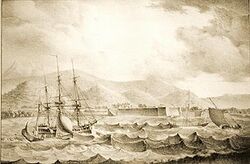Documents of the 15th century clearly distinguished Tskhumi from Principality of Abkhazia.[39] The Ottoman navy occupied the town in 1451, but for a short time. Later contested between the princes of Abkhazia and Mingrelia, Tskhumi finally fell to the Turks in the 1570s. The new masters heavily fortified the town and called it Sohumkale, with kale meaning "fort" but the first part of the name of disputed origin. It may represent Turkish su (Ottoman Turkish: صو), "water", and kum (Ottoman Turkish: قوم), "sand", but is more likely to be an alteration of its earlier Georgian name.[35]