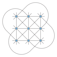 More generally, a finite affine plane of order n has n2 points and n2 + n lines; each line contains n points, and each point is on n + 1 lines.