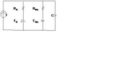 Computational neuroscience is an interdisciplinary field that combines engineering, biology, control systems, brain functions, physical sciences, and computer science. It has fundamental development models done at the lower levels of ions, neurons, and synapses, as well as information propagation between neurons. These models have established the enabling technology for higher-level models to be developed. They are based on chemical and electrical activities in the neurons for which electrical equivalent circuits are generated. A simple model for the neuron with predominantly potassium ions inside the cell and sodium ions outside establishes an electric potential on the membrane under equilibrium, i.e., no external activity, condition. This is called the resting membrane potential, which can be determined by Nernst Equation (Nernst, W. (1888)[24]). An equivalent electrical circuit for a patch of membrane, for example an axon or dendrite, is shown in Figure 5. EK and ENa are the potentials associated with the potassium and sodium channels respectively and RK and RNa are the resistances associated with them. C is the capacitance of the membrane and I is the source current, which could be the test source or the signal source (action potential). The resting potential for potassium-sodium channels in a neuron is about -65 millivolts.