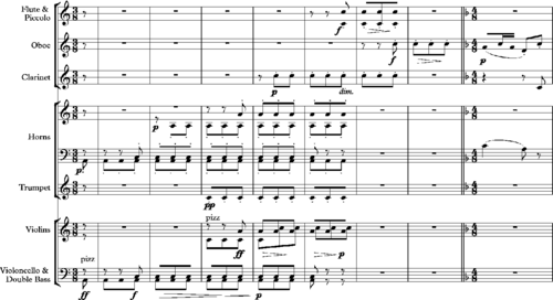Instrumental timbre played an increasing role in the practice of orchestration during the eighteenth and nineteenth centuries. Berlioz[7] and Wagner[8] made significant contributions to its development during the nineteenth century. For example, Wagner's "Sleep motif" from Act 3 of his opera Die Walküre, features a descending chromatic scale that passes through a gamut of orchestral timbres. First the woodwind (flute, followed by oboe), then the massed sound of strings with the violins carrying the melody, and finally the brass (French horns).File:Wagner Sleep music from Act 3 of Die Walkure.wavthumb|center|600px|Wagner Sleep music from Act 3 of Die WalküreDebussy, who composed during the last decades of the nineteenth and the first decades of the twentieth centuries, has been credited with elevating further the role of timbre: "To a marked degree the music of Debussy elevates timbre to an unprecedented structural status; already in Prélude à l'après-midi d'un faune the color of flute and harp functions referentially".[9] Mahler’s approach to orchestration illustrates the increasing role of differentiated timbres in music of the early twentieth century. Norman Del Mar describes the following passage from the Scherzo movement of his Sixth Symphony, as "a seven-bar link to the trio consisting of an extension in diminuendo of the repeated As… though now rising in a succession of piled octaves which moreover leap-frog with Cs added to the As.[10] The lower octaves then drop away and only the Cs remain so as to dovetail with the first oboe phrase of the trio." During these bars, Mahler passes the repeated notes through a gamut of instrumental colors, mixed and single: starting with horns and pizzicato strings, progressing through trumpet, clarinet, flute, piccolo and finally, oboe:thumb|Mahler, Symphony No. 6, Scherzo, Figure 55, bars 5–12