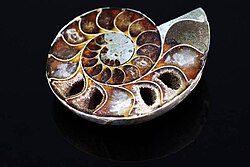 The cephalopods (literally, "head foot" as they have arms/tentacles/whatever round their head) are incredibly significant for two reasons. The history of the cephalopods stretch back as far back as the Upper Cambrian,[5] and they are still an incredibly successful group today. The fossil record of the inkfish mainly consists of the hard-shelled relatives of the modern Nautilus, and demonstrates how the nautilus' shell grew coiled and chambered in beautiful transitions. The nautiloids and ammonoids are incredibly common fossils throughout geologic time.