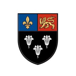 Thus the blazon is: Sable, three lily-flowers argent on a chief per pale azure and gules in the dexter a fleur-de-lys in the sinister a lion passant guardant or. The three lilies are also evident on the coat-of-arms of Eton provost Roger Lupton.[34] Although the charter specifies that the lily flowers relate to the founder's hope for a flourishing of knowledge, that flower is also a symbol for the Virgin Mary, in whose honour the college was founded, with the number of three having significance to the Blessed Trinity. The motto of the college is Floreat Etona ("may Eton flourish"). The grant of arms to King's College, Cambridge, is worded identically, but with roses instead of lily-flowers.[33]