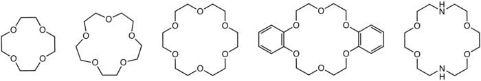 "Aza-crowns" consist of crown ethers wherein an ether oxygen has been replaced by an amine group. A well-known tetrazacrown is cyclen. Mixed amine-ether crowns are also known.[5]