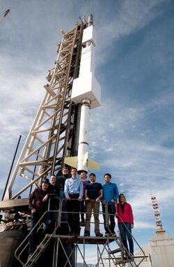 A photograph of the FOXSI team in front of the FOXSI-2 sounding rocket on the launch pad.