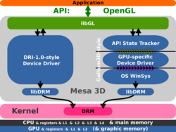 /drivers/gpu/drm/ Each UMD communicates with its kernel mode counterpart with the help of a specific library, name libdrm_specific and a generic one, named libdrm. This section shall look solely on the user-mode part above libdrmOne goal of Mesa is the optimization of code that is to be executed by the respective GPU. Another is the sharing of code. Instead of documenting the pieces of software, this article shall instead look at the Intermediate Representations used in the process of compiling and optimizing. See Abstract syntax tree (AST) and Static single assignment form (SSA form).