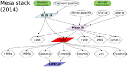 NIR (New Internal Representation) was introduced to overcome TGSI limitations.[149][150] NIR was extended in last and actual releases as base of Spir-V support and is since 2016 main development area. LLVMpipe, i965, RadeonSI, Nouveau, freedreno, vc4 are changed to NIR from TGSI. RADV, Zink and other new drivers starts with NIR. All drivers with full OpenGL 4.6 support are related to NIR by SPIR-V support. Also AMD r600 has a fork with NIR for better support of HD5000 and HD6000 series. This option for r600 is default since Mesa 21.0.