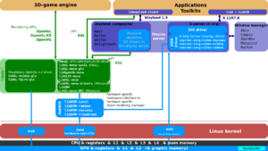 Mesa 21.1 is second release of year 2021.[49] OpenGL 4.6+ and OpenGL ES 3.1+ is available for Zink. AMD Driver 600g can change to NIR with more possibilities for old Radeeon HD 5000 and 6000 cards.[50] Qualcomm Turnip reaches Vulkan 1.1+ and software emulation Lavapipe Vulkan 1.1+. Google VirtIO GPU Driver Venus with Vulkan 1.2+ is merged in experimental state with low performance in mesa main tree.[51]