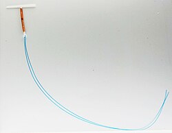 - The intrauterine device (IUD) — Basically a "T"-shaped piece of plastic inserted into the uterus by a doctor. The device may also contain either a copper coil or hormones that are slowly released. Its primary method of action is irritating the uterus by its presence, triggering an immune system response that prevents implantation of any fertilized eggs and makes the uterus inhospitable to sperm. The copper released by copper IUDs is toxic to sperm as well, and hormonal IUDs produce the same effects as other forms of hormonal contraception. This method of contraception carries a slight risk of uterine infection, and is about 99% successful in preventing pregnancy. And as Dr. House explained, the patient may become sensitized to copper and develop a full-blown allergy to it.[12]