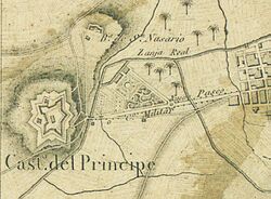 "It lacked the capital of a country walk where you could breathe the pure and free air, and I resolved to undertake it from the field that they call from Peñalver to the hillside where the Prince's castle is located. It was this site, once swampy and watery, the most on purpose for a work of this kind in the surroundings of this city, in the part where it is not surrounded by the sea. There was also another reason that turned the work into doubly useful, which was the frank communication of this square with the castle, interrupted by that part in the rainy season."[167]