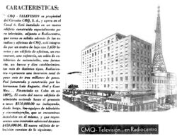 CMQ was a Cuban radio and television station located in Havana, Cuba, reaching an audience in the 1940s and 1950s, attracting viewers and listeners with a program that ranged from music and news dissemination. It later expanded into radio and television networks. As a radio network it was a heated competitor of the RHC-Cadena Azul network. The company was founded on March 12, 1933, by Miguel Gabriel and Ángel Cambó. Ten years later, on August 1, 1943, half of it was acquired by the business group of Goar Mestre. In the beginning, it transmitted only in the capital expanding later to the rest of the country.