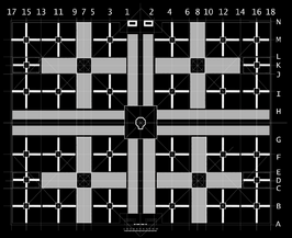 The cemetery is laid out roughly on a north–south axis, parallel to the last stretch of the Almendares River, and against the street grid of Vedado. It is on the north axis, thus its main streets are on the four cardinal points of the compass. Symbolized by a Greek cross, it represents the four directions of the earth and the spread of the gospel to all directions as well as the four platonic elements.[185] We find Greek crosses against a yellow background along the perimeter fence enclosing the cemetery, as well as part of the design diagram of the cemetery, which employs several Greek crosses at different scales thus forming an architectural tapestry. The main avenues, Avenida Cristóbal Colón, Obispo Espada, and Obispo Fray Jacinto, at six hundred by eight hundred meters, is the first cross at the scale of the city (red cross-areal photo).[186]