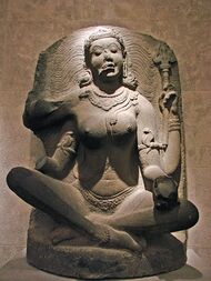 By the fifth century, all these goddesses were incorporated in mainstream orthodox Hinduism as Tantric deities.[20][21] David Kinsley proposes that the Matrikas may be local village goddesses, who were being assimilated in the mainstream. He cites two reasons for his assertion: their description in Mahabharata as dark in colour, speaking foreign languages and living in "peripheral areas" and their association with god Skanda and his father, Shiva, who though Vedic has attributes.[22] Sara L. Schastok suggests that the Matrikas maybe inspired by the concept of Yakshas, who are associated with Skanda and Kubera – both are often portrayed with the Matrikas.[23] In contrast to the Indus valley origins theory, Bhattacharyya notes:
