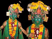 In Varaha Purana, they are created from the distracted mind of goddess Vaishnavi, who loses her concentration while doing asceticism. They are described as lovely and act as the goddesses' attendants on the battlefield.[56] In the Bhagavata Purana, when beings created by Vishnu are enlisted; the Matrikas are listed with rakshasas (demons), bhutas (ghosts), pretas, dakinis and other dangerous beings. In the same text, milkmaids offer a prayer for protection of the infant-god Krishna from the Matrikas.[57]