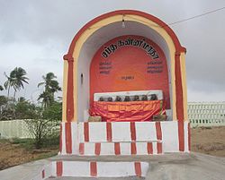 According to Leslie C. Orr, the Saptamatrika, who first appeared in South India in the eighth century, had once temples dedicated exclusively to them, but the ninth century onwards, they were demoted to status of "deities of the entourage" (parivara devata) of Shiva. Their images moved from the sanctums to corners of temple complexes and now they are as guardian deities in small village shrines.[84] The Saptamatrikas are worshipped as Sapta kanya (the celestial nymphs) in most South Indian Shiva temples especially in Tamil Nadu. But the Selliyamman temple at Alambakkam in Tiruchirapalli district (In 1909 called Trichonopoly district) is important in worship of the Matrikas. Here once stood a temple dedicated to the Saptamatrika, which was replaced by the present temple.[85][86]