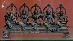 ![]() The Seven Mother Goddesses (Matrikas) flanked by Shiva (left) and Ganesha (right) | |