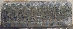 The Saptamatrkas are generally carved in relief on a rectangular stone slab in the sequential order of Brahmani, Maheshvari, Kumari, Vaishnavi, Varahi, Indrani and Chamunda, being flanked by two male figures – a terrible form of Shiva (Virabhadra) and his son Ganesha in both sides (first – on their right and last – on their left). Thus, the Matrikas are considered Saivite goddesses.[12] They are often depicted on the lintel slabs of the main door of a Shiva temple – mainly in the Jaunsar-Bawar region, with their respective mounts forming the pedestal.[6] Sometimes, they are occupied by the couple Uma-Maheshvara (Parvati and Shiva). The earliest instance of their portrayal with Uma-Maheshvara is at Desha Bhattarika, Nepal although now the Matrika images have withered away.[65] The 12th century Sanskrit author Kalhana mentions worship of Matrikas with Shiva in Kashmir, his work Rajatarangini.[19]