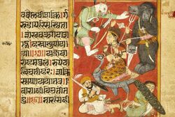 In Matsya Purana, Shiva had created seven Matrikas to combat the demon Andhaka, who had the ability to duplicate from each drop of his blood that falls from him when he is wounded.[lower-alpha 2] The Matrikas drink up his blood and help Shiva defeat the demon. After the battle, the Matrikas begin a rampage of destruction by starting to devour other gods, demons and peoples of the world. Narasimha, Vishnu's man-lion incarnation, creates a host of thirty-two benign goddesses who calm down the terrible, fire-breathing Matrikas. Narasimha commanded the Matrikas to protect the world, instead of destroying it and thus be worshipped by mankind. At the end of the episode, Shiva's terrible form Bhairava is enshrined with the images of the Matrikas at the place where the battle took place.[53][19] This story is retold in Vishnudharmottara Purana.[54] Vishnudharmottara Purana further relates them with vices or inauspicious emotions like envy, pride, anger etc.[55]