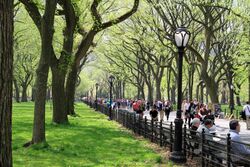 New York City 's Central Park is home to approximately 1,200 American elms. The oldest of these elms were planted during the 1860s by Frederick Law Olmsted, making them among the oldest stands of American elms in the world. The trees are particularly noteworthy along the Mall and Literary Walk, where four lines of American elms stretch over the walkway forming a cathedral-like covering. A part of New York City's urban ecology, the elms improve air and water quality, reduce erosion and flooding, and decrease air temperatures during warm days.[72]