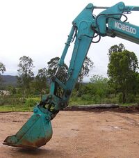 A backhoe—also called rear actor or back actor—is a type of excavating equipment, or digger, consisting of a digging bucket on the end of a two-part articulated arm. It is typically mounted on the back of a tractor or front loader, the latter forming a "backhoe loader" (a US term, but known as a "JCB" in Ireland and the UK).[1] The section of the arm closest to the vehicle is known as the boom, while the section that carries the bucket is known as the dipper (or dipper-stick), both terms derived from steam shovels. The boom, which is the long piece of the backhoe arm attached to the tractor through a pivot called the king-post, is located closest to the cab. It allows the arm to pivot left and right, typically through a range of 180 to 200 degrees, and also enables lifting and lowering movements.