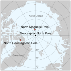 | North geomagnetic pole | [ ⚑ ] 79°12′N 71°06′W / 79.2°N 71.1°W | [ ⚑ ] 79°36′N 71°36′W / 79.6°N 71.6°W | [ ⚑ ] 80°06′N 72°12′W / 80.1°N 72.2°W | [ ⚑ ] : 80°42′N 72°42′W / 80.7°N 72.7°W |
