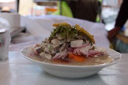 Ceviche is Peru's national dish. It is made with salt, garlic, onions, hot Peruvian peppers, and raw fish that is marinated in lime. In northern Peru, one can find black-oyster ceviche, mixed seafood ceviche, crab and lobster ceviche. In the Andes one can also find trout ceviche and chicken ceviche.[112]