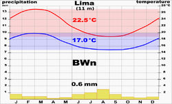 Lima has a mild climate, despite its location in the tropics and in a desert.[49] Lima's proximity to the waters of the Pacific Ocean leads to intense maritime moderation of the temperatures, thereby making the climate much milder than those to be expected for a tropical desert, and thus Lima can be classified as a desert climate (Köppen: BWh) with subtropical temperature ranges.[50] Temperatures rarely fall below 12 °C (54 °F) or rise above 30 °C (86 °F).[51] Two distinct seasons can be identified: summer, December through April, and winter from June through September/October. May and October/November are generally transition months, with a more dramatic warm-to-cool weather transition in later May or/and earlier June.[52] Situated onshore from the cold ocean waters, rainfall is extremely rare in Lima.