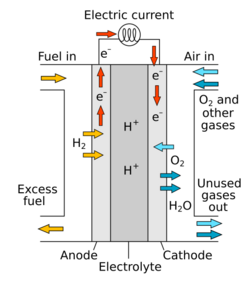 A fuel cell is an electrochemical cell that converts the chemical energy from a fuel into electricity through an electrochemical reaction of hydrogen fuel with oxygen or another oxidizing agent.[10] Fuel cells are different from batteries in requiring a continuous source of fuel and oxygen (usually from air) to sustain the chemical reaction, whereas in a battery the chemical energy comes from chemicals already present in the battery. Fuel cells can produce electricity continuously for as long as fuel and oxygen are supplied.