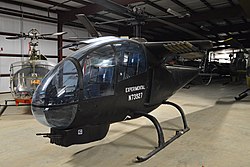 A proof-of-concept contract was awarded to Bell in December 1962 for the Model 207 Sioux Scout, which was, in essence, a new forward fuselage and Bell 47G-3 dynamic parts fitted to a Bell 47J center and rear fuselage.[3][4][5] The Sioux Scout included all the key features of a modern helicopter gunship – a tandem cockpit, stub wings for weapons, and a chin-mounted gun turret.[3] The tandem cockpit placed the gunner in the lower front seat with the pilot in the rear, with both crew positions featuring flight controls. The gunner's position featured a gunsight and turret controls located in the center, so the flying controls were moved to the side of the front cockpit.[2] The gunner controlled a chin-mounted gun turret with twin 7.62 mm (.308 in) M60 machine guns. The stub wings held external fuel tanks.[6]
