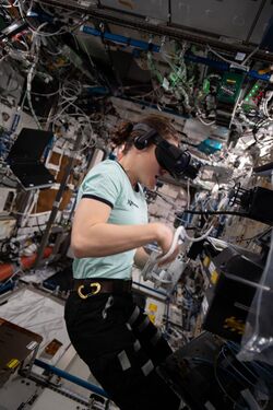 NASA astronaut and Expedition 59 Flight Engineer Christina Koch wears a VR headset for the Vection study that is exploring how microgravity affects an astronaut's motion, orientation and distance perception in 2019