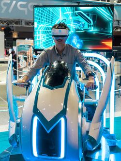 Since 2015, roller coasters and theme parks have incorporated virtual reality to match visual effects with haptic feedback.[69] Virtual Reality Attractions can now be found in many Family Entertainment Centers (FECs), and increasingly hold a substantial presence in FEC Expos such as the major International Association of Amusement Parks and Attractions (IAAPA) Expo. In March 2018, a VR system for water slides was launched at the Galaxy Erding in Germany, using a waterproof headset.[70]