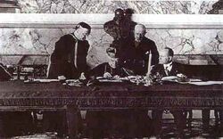 Mussolini (far right) signing the Lateran Treaty (Vatican City, 11 February 1929)