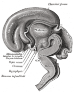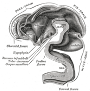 At the beginning of the third week of development, the embryonic ectoderm forms a thickened strip called the neural plate.[65] By the fourth week of development the neural plate has widened to give a broad cephalic end, a less broad middle part and a narrow caudal end. These swellings are known as the primary brain vesicles and represent the beginnings of the forebrain (prosencephalon), midbrain (mesencephalon), and hindbrain (rhombencephalon).[66]