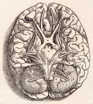 In 1316, Mondino de Luzzi's Anathomia began the modern study of brain anatomy.[230] Niccolò Massa discovered in 1536 that the ventricles were filled with fluid.[231] Archangelo Piccolomini of Rome was the first to distinguish between the cerebrum and cerebral cortex.[232] In 1543 Andreas Vesalius published his seven-volume De humani corporis fabrica.[232][233][234] The seventh book covered the brain and eye, with detailed images of the ventricles, cranial nerves, pituitary gland, meninges, structures of the eye, the vascular supply to the brain and spinal cord, and an image of the peripheral nerves.[235] Vesalius rejected the common belief that the ventricles were responsible for brain function, arguing that many animals have a similar ventricular system to humans, but no true intelligence.[232]