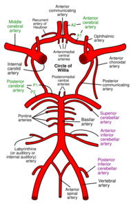 The internal carotid arteries supply oxygenated blood to the front of the brain and the vertebral arteries supply blood to the back of the brain.[56] These two circulations join in the circle of Willis, a ring of connected arteries that lies in the interpeduncular cistern between the midbrain and pons.[57]