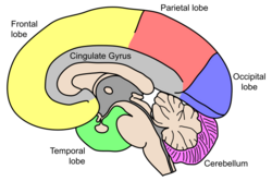 The cerebrum, consisting of the cerebral hemispheres, forms the largest part of the brain and overlies the other brain structures.[7] The outer region of the hemispheres, the cerebral cortex, is grey matter, consisting of cortical layers of neurons. Each hemisphere is divided into four main lobes – the frontal lobe, parietal lobe, temporal lobe, and occipital lobe.[8] Three other lobes are included by some sources which are a central lobe, a limbic lobe, and an insular lobe.[9] The central lobe comprises the precentral gyrus and the postcentral gyrus and is included since it forms a distinct functional role.[9][10]