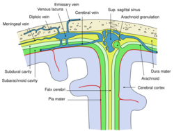 | Vein | Internal jugular vein, internal cerebral veins; external veins: (superior, middle, and inferior cerebral veins), basal vein, and cerebellar veins |