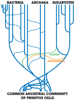 Horizontal gene transfer is the transfer of genetic material from one organism to another organism that is not its offspring; this is most common among prokaryotes.[55] In medicine, this contributes to the spread of antibiotic resistance, as when one bacteria acquires resistance genes it can rapidly transfer them to other species.[56] Horizontal transfer of genes from bacteria to eukaryotes such as the yeast Saccharomyces cerevisiae and the adzuki bean beetle Callosobruchus chinensis may also have occurred.[57][58] An example of larger-scale transfers are the eukaryotic bdelloid rotifers, which appear to have received a range of genes from bacteria, fungi, and plants.[59] Viruses can also carry DNA between organisms, allowing transfer of genes even across biological domains.[60] Large-scale gene transfer has also occurred between the ancestors of eukaryotic cells and prokaryotes, during the acquisition of chloroplasts and mitochondria.[61]