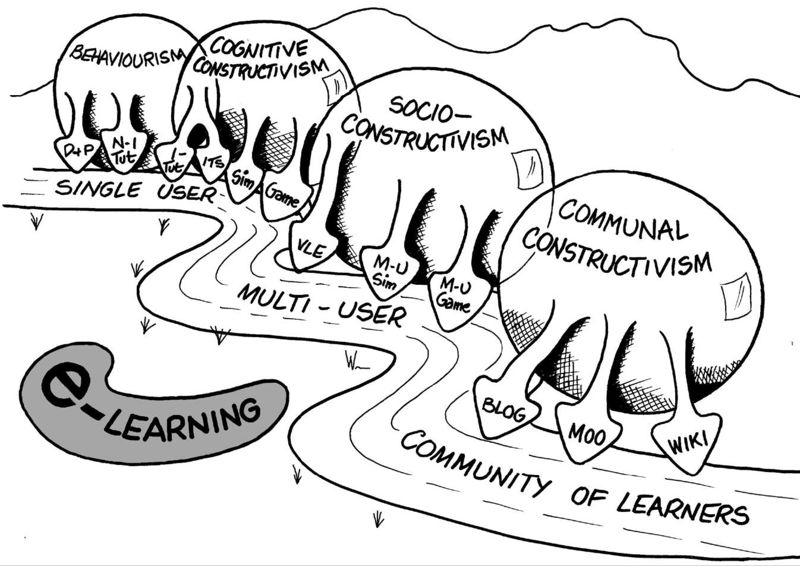 “e-Learning takes the concept of ‘community of learners’ a considerable step forward by enabling less formal communities, that is, less formal than the organizational structure of business enterprises or a school or university would imply, to create a self-sustaining communal learning environment. We call this extension to the range of socio-constructivist variants ‘communal constructivism’ (Holmes et al., 2001), a process in which individuals not only learn socially but contribute their learning to the creation of a communal knowledge base for other learners. Online learning affords them the linked community, the knowledge bases, the knowledge-creation tools and the facility to provide their learning for others.” Holmes & Gardner (2006:76) [4]