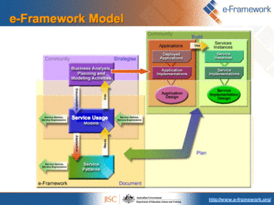 “The e-Framework for Education and Research is an initiative by the UK's Joint Information Systems Committee (JISC) and Australia's Department of Education, Science and Training (DEST). The primary goal of the e-Framework is to facilitate technical interoperability within and across education and research through improved strategic planning and implementation processes.” (e-framework.org home page, retrieved 12:29, 24 April 2007 (MEST)).