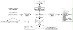 Open Education is both an umbrella term and a complex ecosystem that operates on a number of very different levels. It is inherently open in the way it functions and cannot be captured by a single definition. It considers knowledge as a common good. Its intrinsic values of freedom and transparency assure contribution and access to the discovering of all forms of knowledge, under the sole condition of respecting authorisation to access it, e.g. indigenous knowledge. It is articulated around the remaining values of responsibility, sharing, justice, agency and ubiquitous ownership (Baker, 2017). It is neither synonymous of free nor of extractive approaches. It strives to find sustainable models at all levels – epistemic, legal, social, economic, political, ecologic, infrastructure, etc. Open Education represents an alternative approach that exists since the Middle Ages and is at the heart of the establishment of European universities (see for ex. Peter & Deimann, 2013, p. 9). It is a means (Paola Corti, 2022, private communication) to foster knowledge societies by leveraging collective human intelligence.