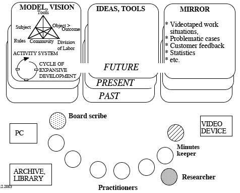 During the lab sessions, practitioners take momentarily distance from their individual tasks and routine. Their joint activity becomes the object of their collaborative inquiry and developmental experimentation. Participants usually meet during work hours, once every one/two weeks, or even every afternoon, in the context of an intensive workshop. Based on the ethnographic analysis of the current practices (mirror) and the contradictions they have to face, the CL focuses on producing a new model of activity that defines a Zone of Proximal Development for the group. This ZPD is the distance between present actions of the individuals and the new form of group activity collectively generated as a solution to contradictory constraints (double-bind) potentially embedded in their everyday actions. That ZPD becomes the conceptual space where the group can expand the object of its activity, to produce eventually a new object. When put on trial, the new model is evaluated by the group by means of reflective tools (mirroring diagrams, video, diaries, etc), so that it can be questioned, bent and improved.