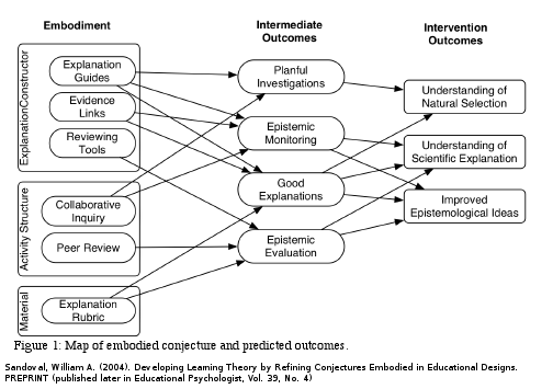 “ExplanationConstructor and related aspects of the BGuILE learning environment were designed by conjecturing that epistemological conceptions influence scientific inquiry to the extent that they frame particular goals for the kinds of knowledge inquiry can generate, while such ideas are practically helpful only to the extent that conceptual knowledge of particular domains can generate possible explanations and investigative strategies. This conjecture led to the design conjecture to integrate conceptual and epistemic scaffolds for inquiry, which was predicted to help students both learn a particular science topic and about scientific epistemology.” (Sandoval 2004a).