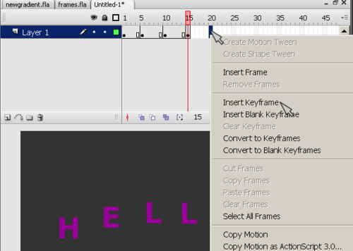 - Hit F6 or Right-click; Insert Key Frame for the "hello" layer