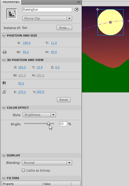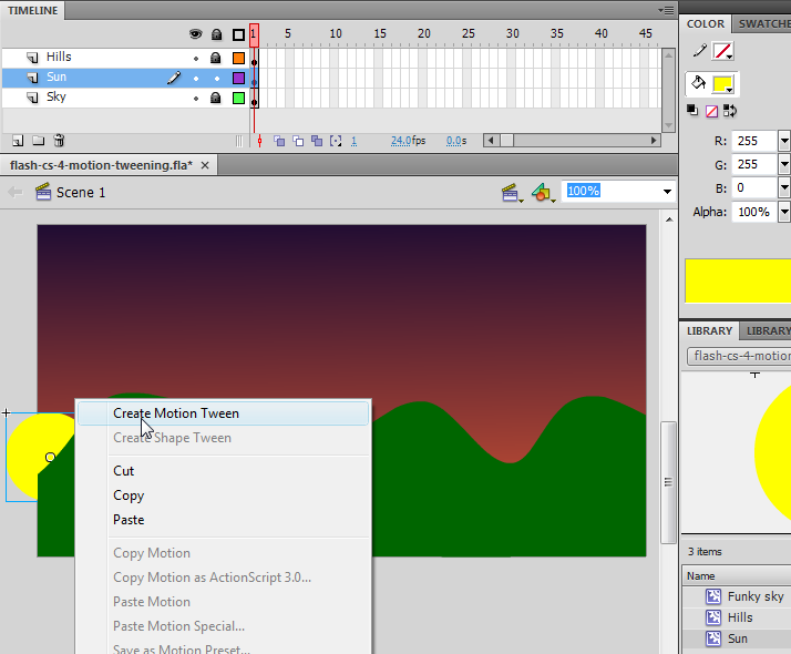 In the following screenshot we show how to add a motion tween to an "Raising Sun" symbol of the "Sun" which is in the library.