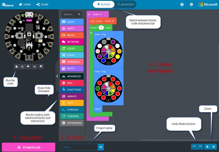 Makecode is an online environment composed of three parts (see image below)