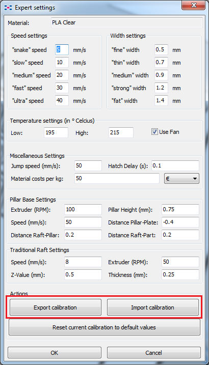 Unlike skeinforge, this software works with a calibration procedure. For each kind (an color) of polymer, you will have to print out 16 calibration squares whose walls you then have to measure with a caliper.