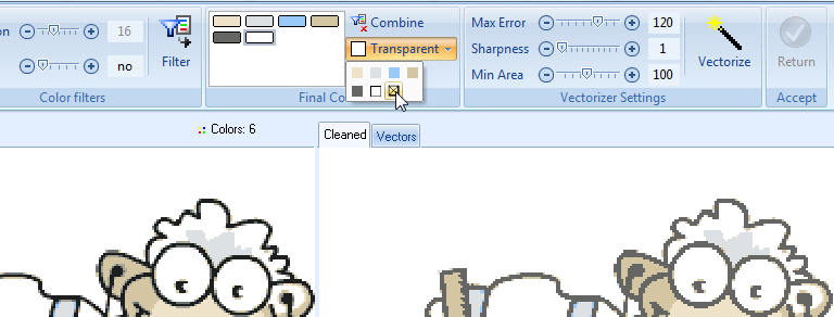Let's cleanup the picture a bit, i.e. remove some speckles, manually merge colors and finally decide about the background color.