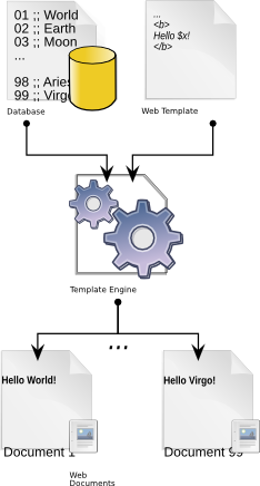 “Templating, and in particular Web templating, involves the presentation of information in a form which is often (but not always) intended to be readable, even attractive, to a human audience. Frequently, templating solutions involve a document (the template) which may look somewhat like the final output but perhaps in a simplified or stylized form, along with some data which must be presented using that template; combining these two things produces the final output which in Web templating is usually (but not always) a Web page of some kind.” (Templating in Python, retrieved 18:15, 14 September 2009 (UTC) )